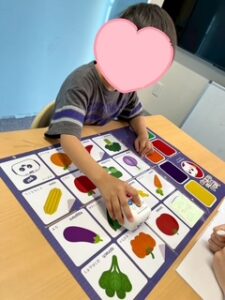 まずは、指定された色のくだもの・やさいを見つけます👀