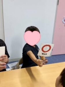問題を出すお友だちは、○と×の札を見せながら「Yes」「No」で正解か不正解かをみんなに伝えます🗣️