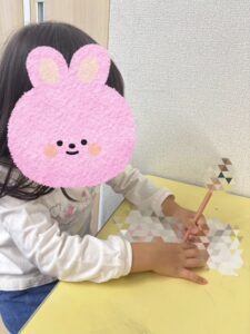 お友達の指示を聞いて福笑いをする