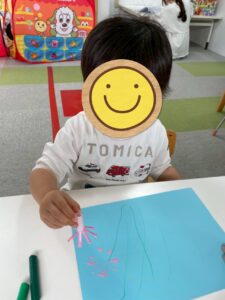 今回は、ストローの先を8枚の花びらに見立てて切ったスタンプで