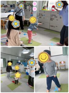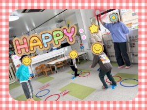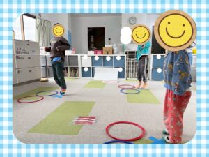 そして音楽が止まった瞬間、前の支援員が手に持つボールの色をよく見て、同じ色のフープへ素早く入る子が多く、これまでの積み重ねが力になっていることを感じました
