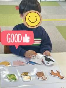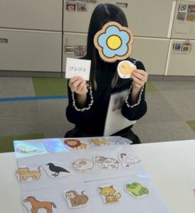 今回の活動では動物に絞り、子どもたちにはオノマトペカードを1枚引いてもらい、引いたカードと同じ動物のイラストカードを選んでもらいました
