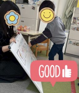 その後は〈おうちへかえろう〉です!この曲は指定の数字のおうちに動物たちが帰っていくという設定で取り組みました!子どもたちに動物のイラストカードを渡し、数字のお家を指定すると、子どもたちは支援員の声をよく聞いてイラストカードを貼りに来てくれましたよ🍀とても楽しんで取り組むことができました!