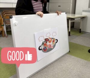 などの具材や調味料のイラストカードを使い、歌に合わせてお鍋のイラストに貼っていきました!