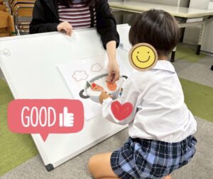 マッチングの後にはひらがなカードを見せて「これなぁに?」と聞くと、「“な”!!」「“に”!!」と元気いっぱいに答えてくれました