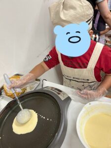 ④おたま1杯生地をすくって入れる(ホットプレートに油を入れ薄く広がる作業は支援員がします)
