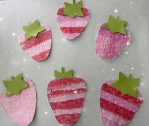 2.イチゴの台紙にのりをつけ、ちぎった花紙をはりつけます。