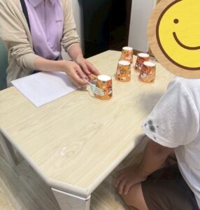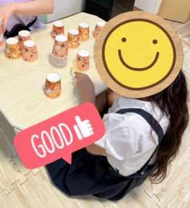 集中して紙コップを積み上げていました!
