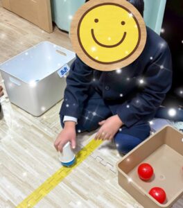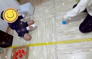今回のポイントは、転がってくるボールをよく見て、紙コップでキャッチしてもらうことと、色別にボールを分けてもらいます⚾️