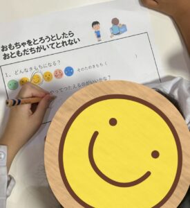 1問目は、”おもちゃを取ろうとしたらお友達がいてとれない”時どうすればいいかな?と考えてもらいました😊