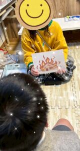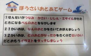 今回の活動では、防災活動として地震、火事、津波、ミサイルが来た時になる音を聞いてもらい、イラストと音とのマッチングを行います🌟