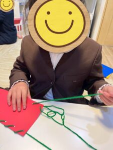 ①等間隔に穴の開いた画用紙に紐を通す(まつり縫い)