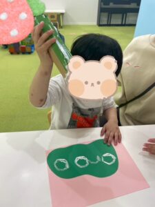 緑のお洋服から出ないように慎重に押したり、勢いよく全面にスタンプしたり、擦って見たり…スタンプにもそれぞれの工夫が見られました✨