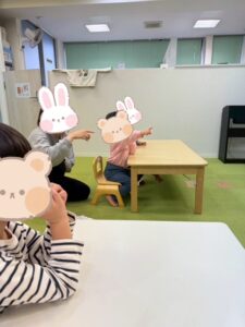 その後、支援員がお手本となって福笑いの遊び方を伝えました。目を閉じながら目や眉毛、ほっぺなどをだるまさんのお顔に乗せ始めると、「変なお顔〜!」と笑ったり「目はもっと上だよ!」と支援員が張り付けやすいようにパーツの位置を教えてくれたりたくさん反応を示してくれました✨️