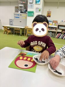 「お目目を閉じてお顔を作っても良いし、目を開けて作りたいお顔にしても良いですよ♪」と伝えると、「お目目開けてする!」「お目目瞑ってする!」と子どもたち自身がしたい方法を選んで制作を始めました🙆🏻♀️