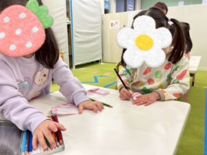 次は折り紙にお雛様とお内裏様のお顔を描いていきます。髪の毛を丁寧に描いてくれたり、まつ毛を描いてくれたり…みんなそれぞれ素敵な顔が描けました♡