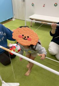 サンタさんを息で吹いてもらい