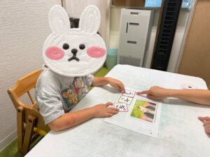「うさぎをさわる」や、「さかなをつる」などと助詞と動詞等を組み合わせて二語分を作っていきます👏🏻