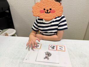なんの写真か当ててもらい、その文字を並べていきます🙆🏻‍♀️文字を並べる枠は4枠あるので、児童によっては「4つ!」と気づいたり、写真のものが3文字だった場合は「1つない?」などと気づいて教えてくれたりします☺️