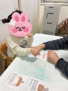カードで慣れてきたら、ぬいぐるみや具体物を使って歌ってみたり、子ども本人の位置を確認する歌にしてみたり、ひとりひとりの段階に合わせて取り組み方を変えていこうと思います