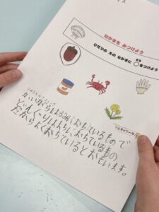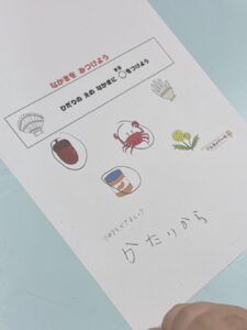 活動では、1人ずつプリントを配り📄、一つの絵と「なかま」だと思うものをイラストの中から選び、丸で囲んでもらいました✏️⭕
