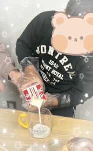 牛乳を量る係・流し入れる係、卵を割って入れる係、粉を入れる係と役割を分けて行いました。