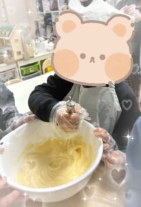 混ぜる作業は、10回ずつ順番に行い、自然と周りのお友だちが数を数えてくれる場面も見られ、とても協力的な様子でした😊