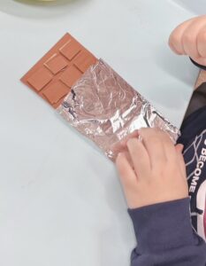アルミホイルで包んだ後、板チョコにメッセージを書いていきました✏️