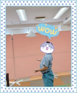 支援員が見本を見せ、どのように動けば新聞紙が体に張り付いたまま走れるかを一緒に考えてもらいました🙂