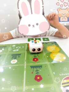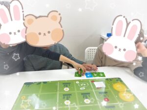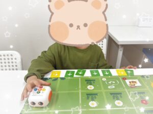 どう進むのか話し合ってカードを置き、一人がロボットのボタンをセットします。