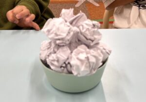 コピー用紙を丸めたものをお団子に見立てて、お皿に積み上げていくゲームです。