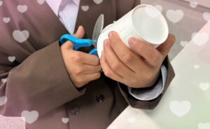 紙コップにある線にそって、ハサミでチョキチョキ✂️