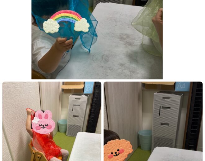 こんにちは ハッピースマイル南堀江です ハッピースマイルでは、 子どもたち一人ひとりの発達に応じた、 ことば音楽療法プログラムを行っています 今回は、『スカーフを使って』についてご紹介します..