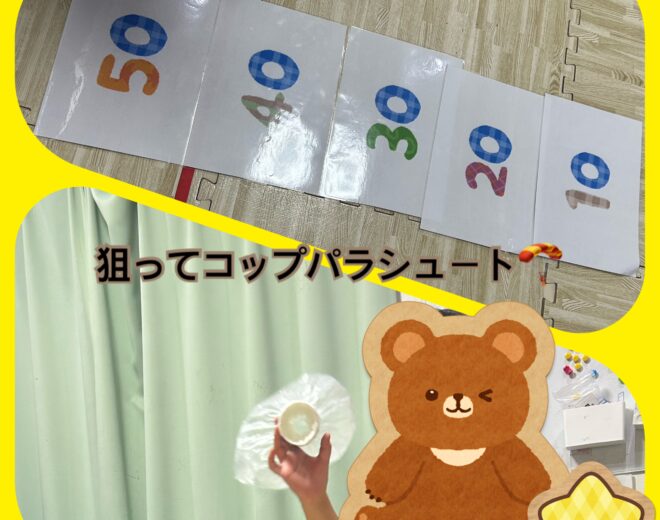 こんにちは! ハッピースマイル北堀江です🌼 今日のからだづくりの様子を お伝えしたいと思います👀 今回の活動では、『狙ってコップパラシュート』をしていきます! ①力加減..
